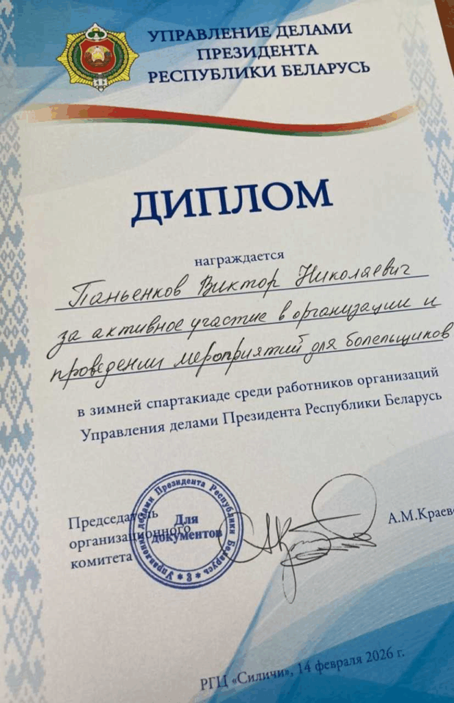 ВИКТОР ПАНЬЕНКОВ, член Молодежного совета Управляет делами Президента Республики Беларусь, отмечен дипломом за активную работу с болельщиками спартакиады.